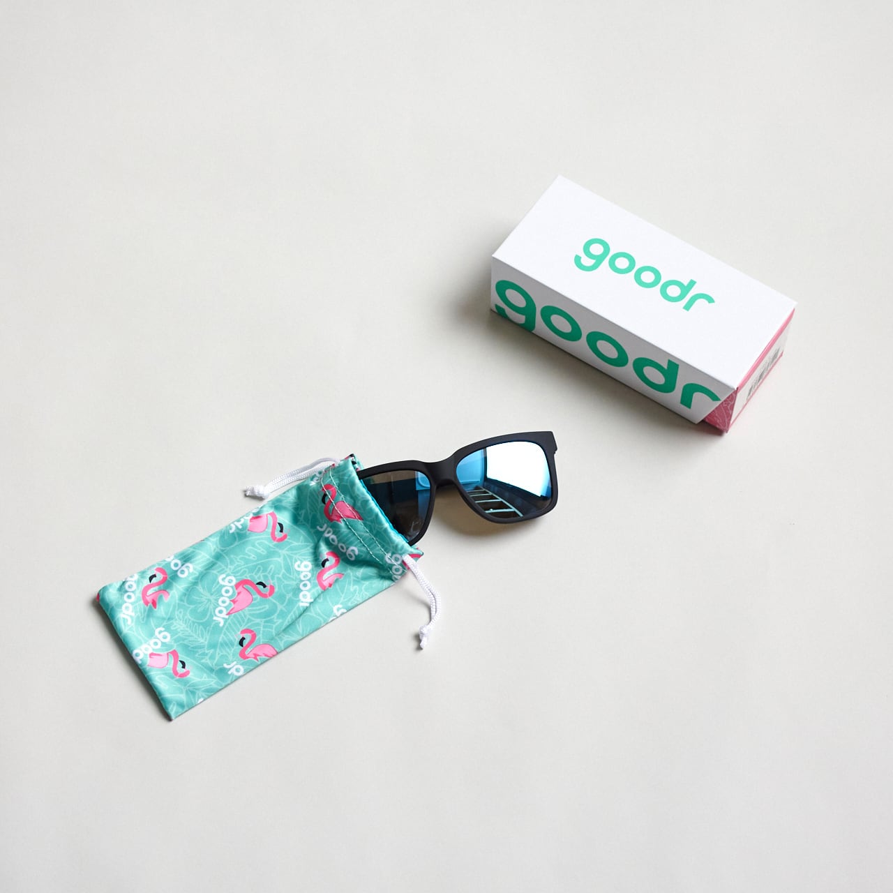 サングラスを入れているgoodr袋はマイクロファイバーのバックとなります。持ち運びはもちろん、お手入れにもぜひご利用ください。