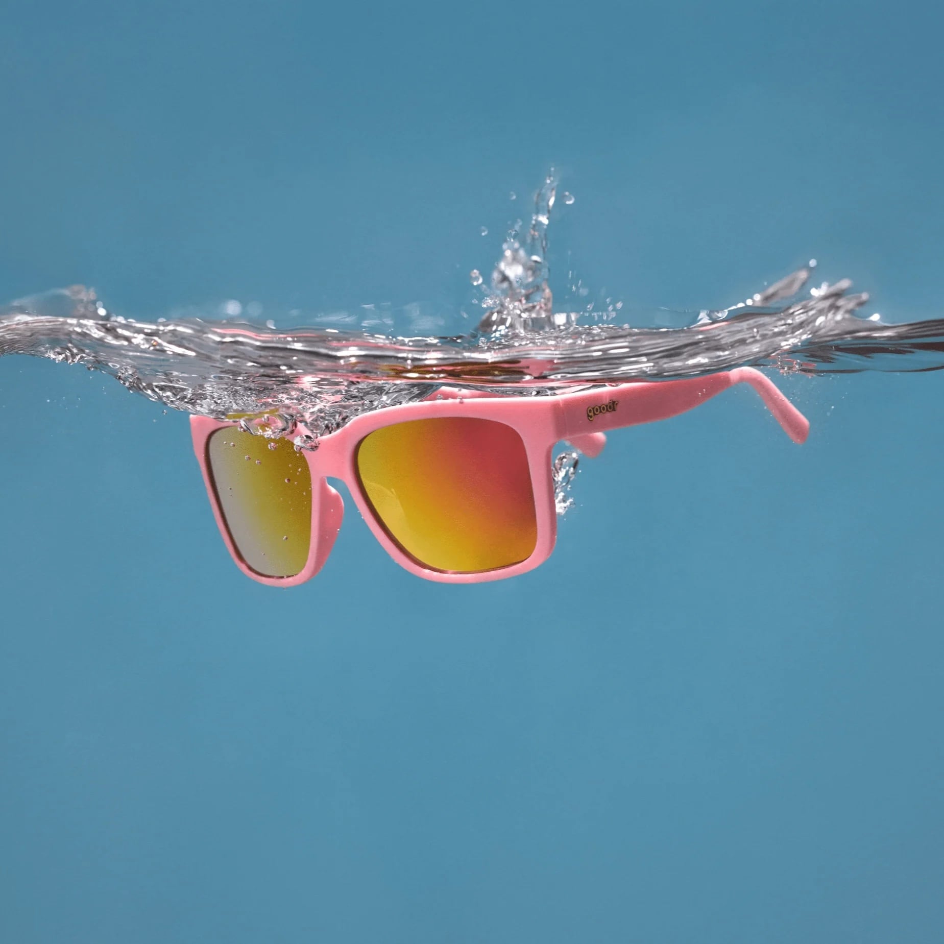 このピンクの「Tidal G」サングラスは、反射性の撥水レンズを備えた“沈まない”モデル。