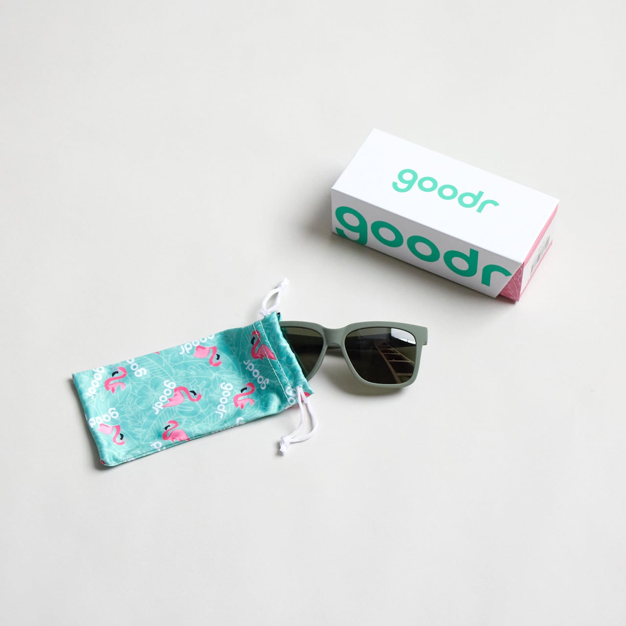 サングラスを入れているgoodr袋はマイクロファイバーのバックとなります。持ち運びはもちろん、お手入れにもぜひご利用ください。
