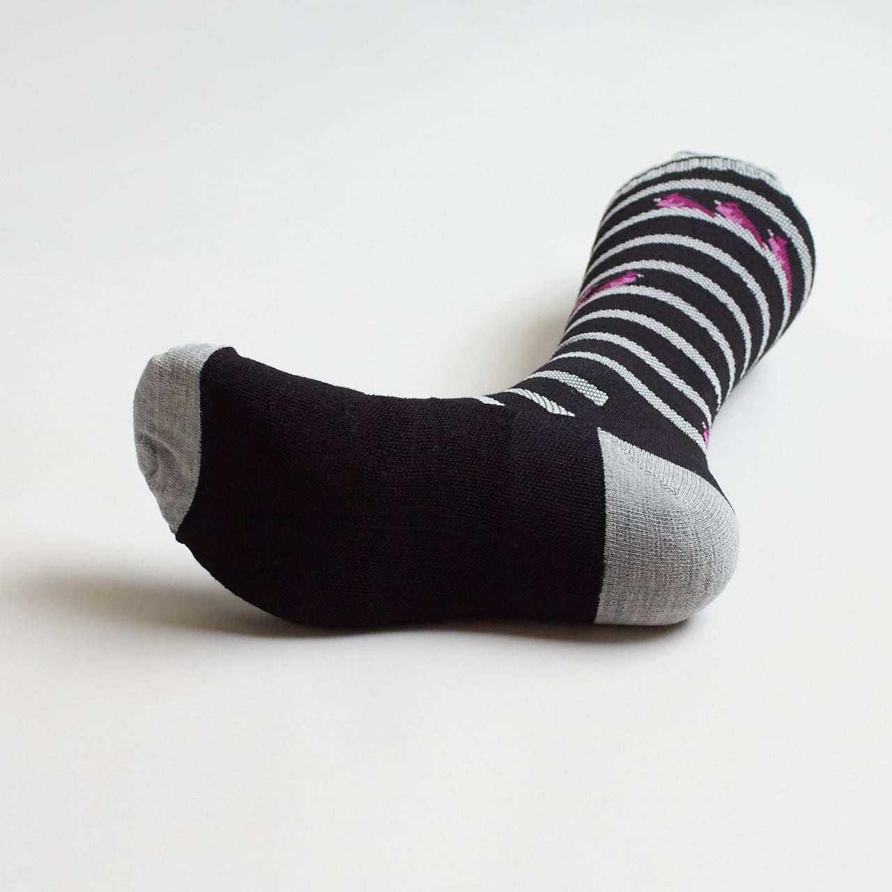 爽やかなストライプに小さな赤い鳥が舞う遊び心あるデザイン。足元に軽やかな印象を添えます。