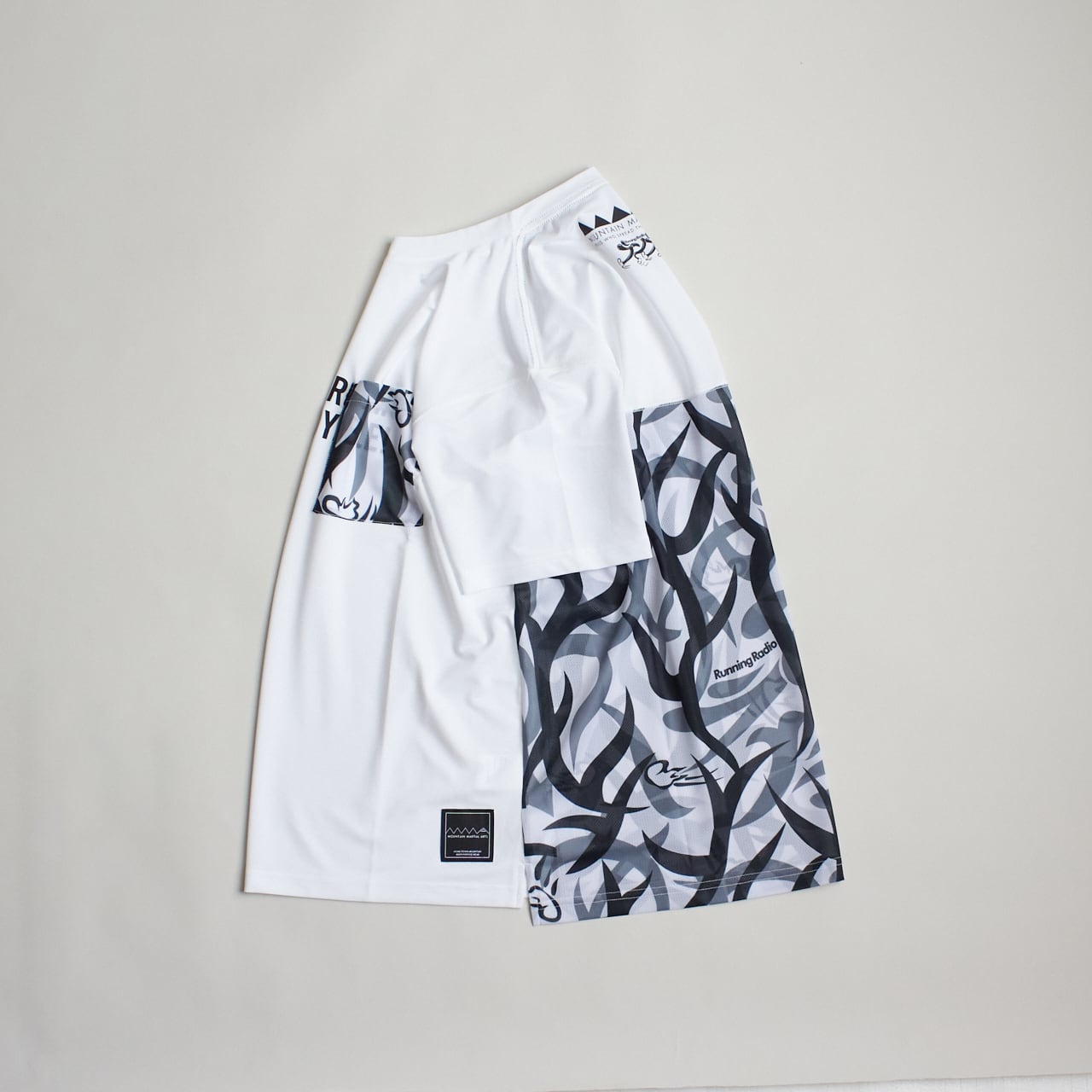 ランニングイベントの MC、PODCAST「ランラジ」パーソナリティとして人気の岡田拓海さん(タクミくん)。フルマラソンサブスリー、100 マイルトレイル完走とガチな実力の持ち主ながら、明るいキャラクターでランニングの楽しさを伝えている。タクミくんのランラジロゴをトライバルカモにアレンジ。背中をメッシュで切り替えたポケットTシャツ。