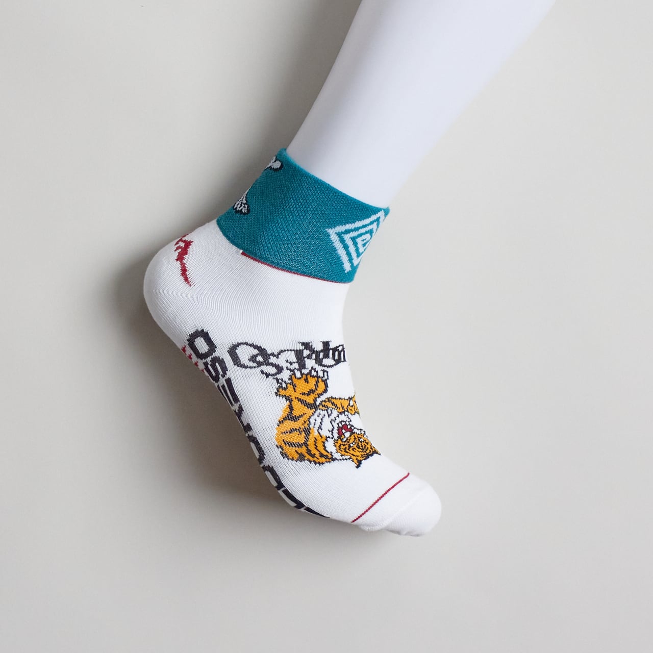 ウェアのデザインに使用したユーモラスなモチーフを、細やかなジャカード(織り柄)で表現した靴下です。