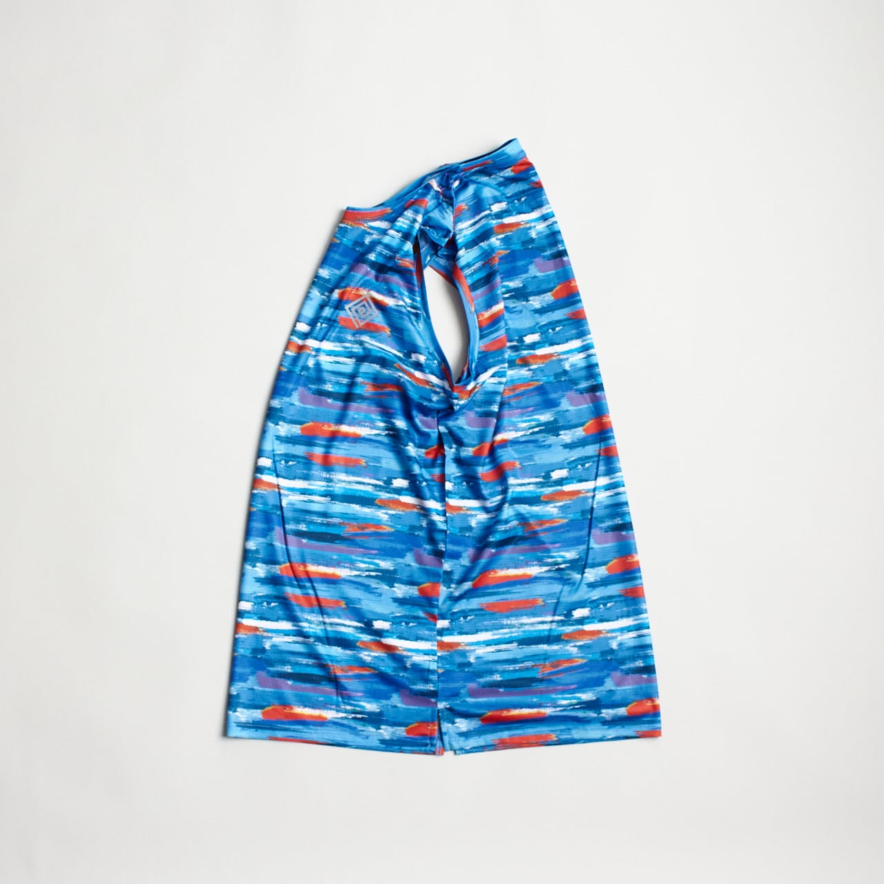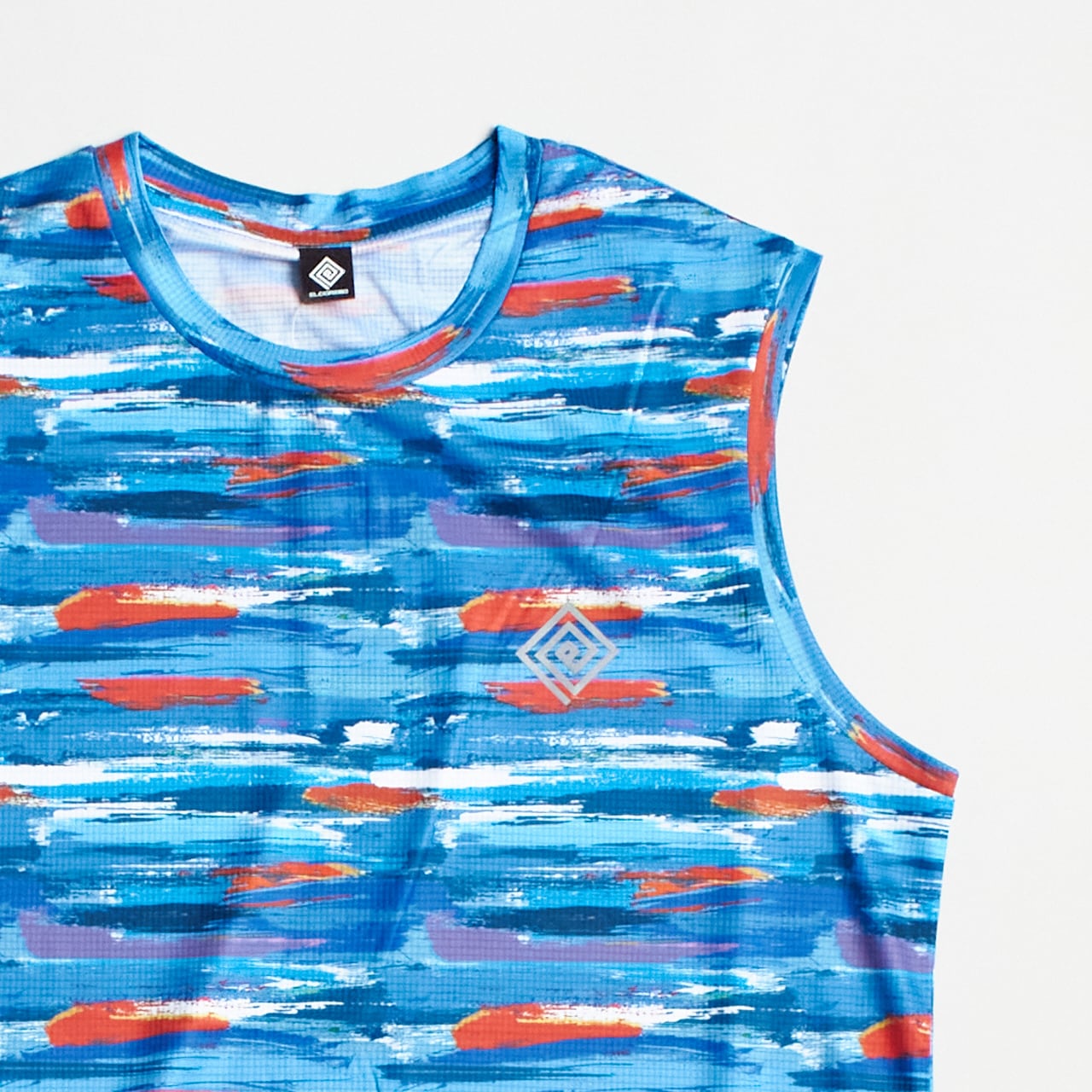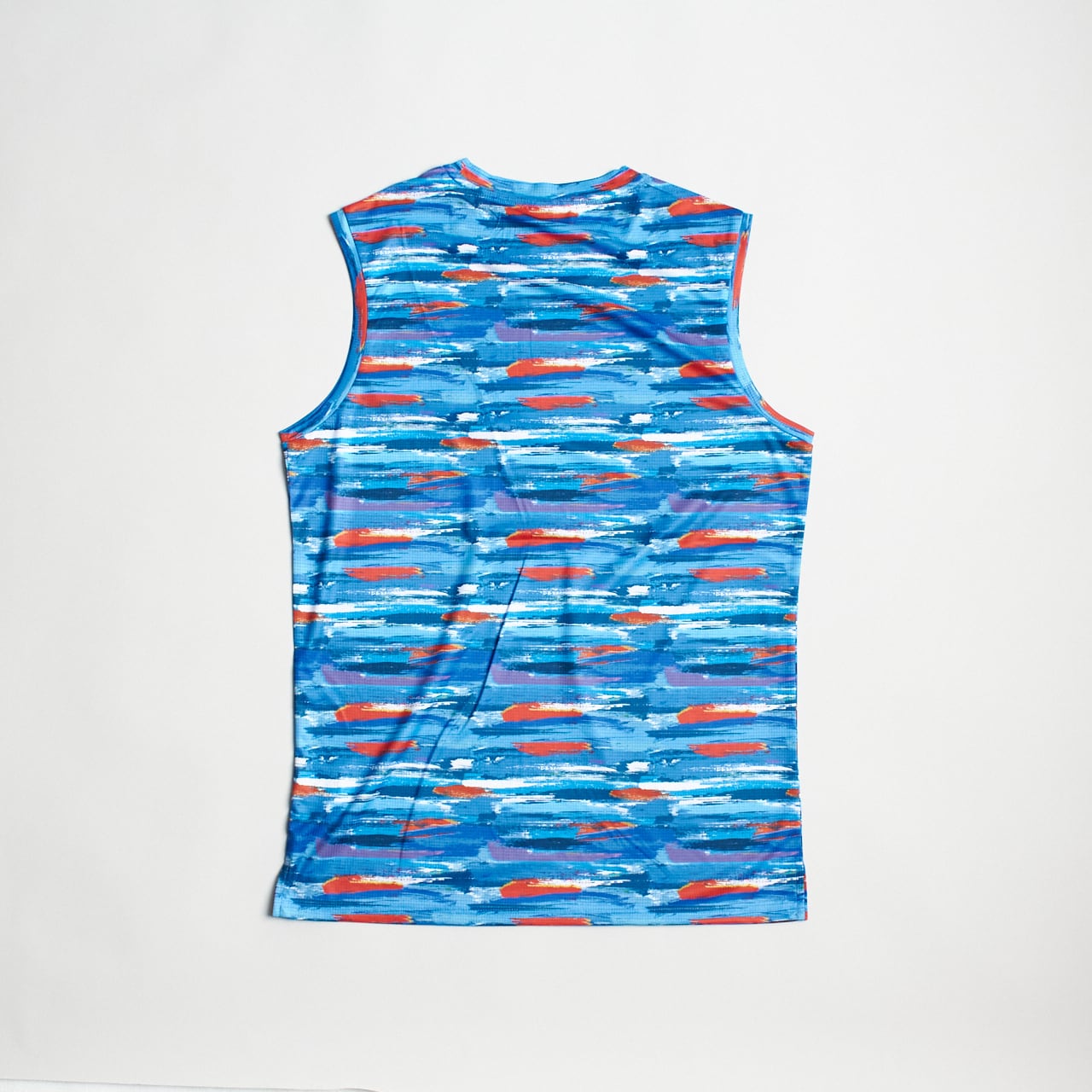 スポーツウェアで多用される昇華転写プリントによるデザインの可能性を最大限に活かすべく、緻密で色鮮やかなグラフィックを表現したオリジナルテキスタイルを使用したノースリーブのランニングシャツです。