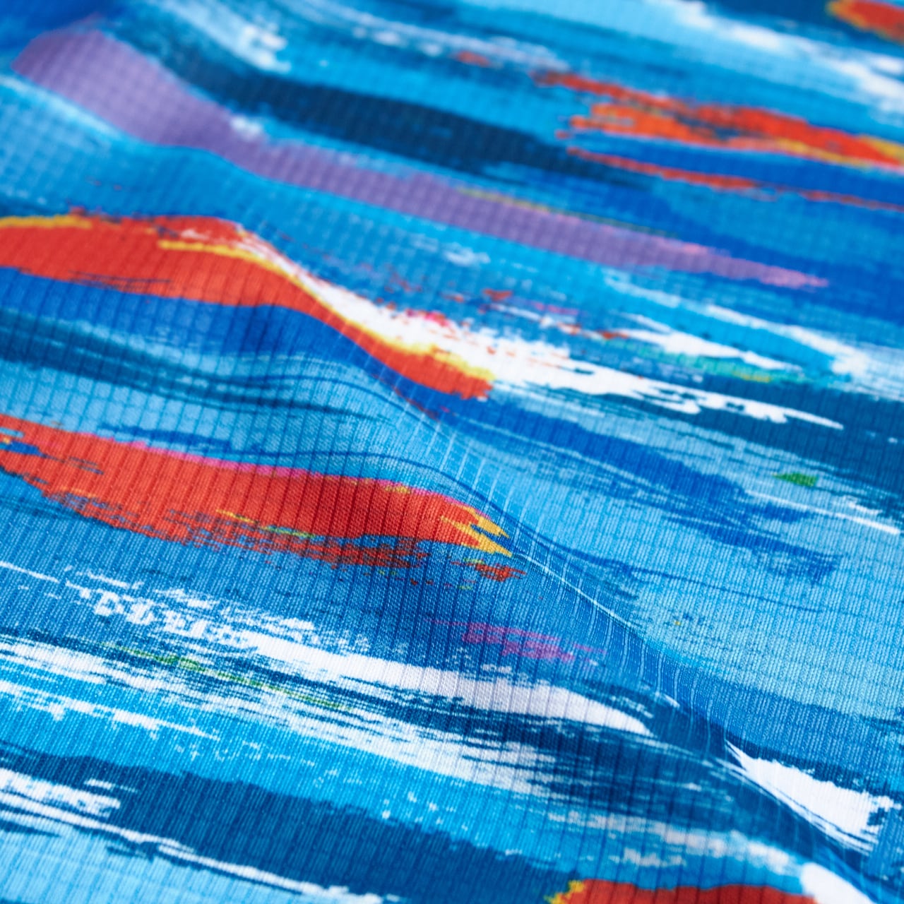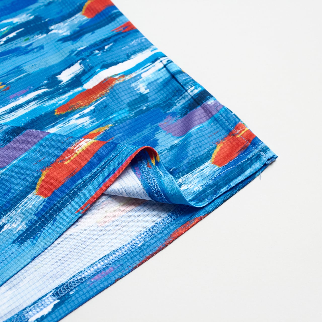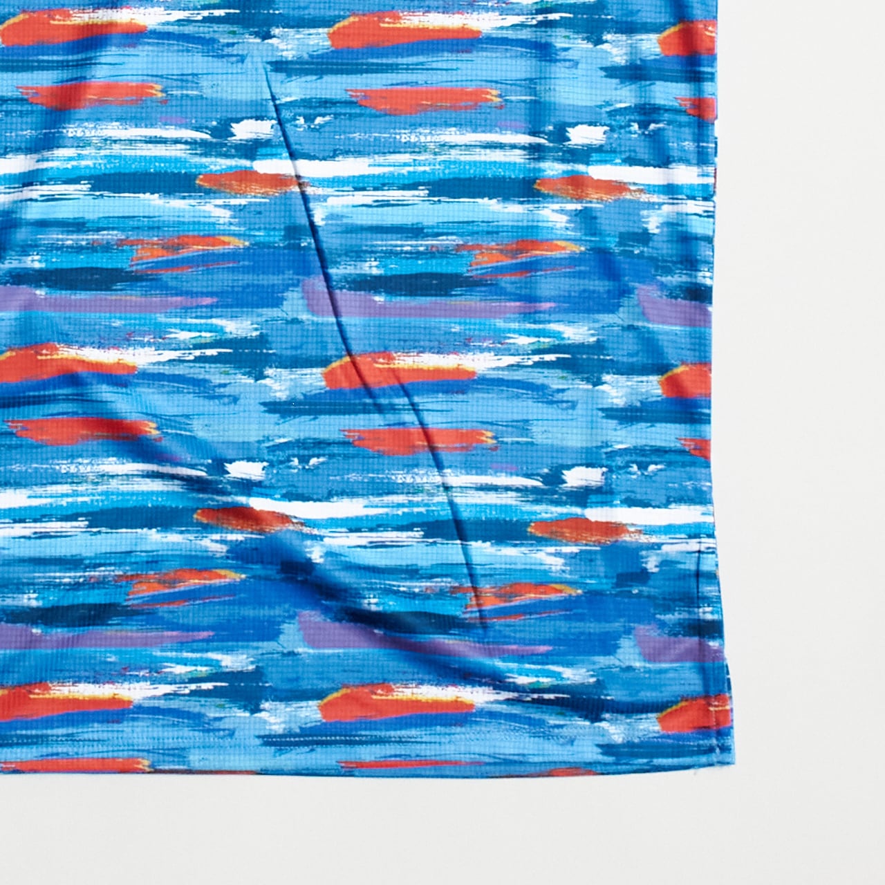 スポーツウェアで多用される昇華転写プリントによるデザインの可能性を最大限に活かすべく、緻密で色鮮やかなグラフィックを表現したオリジナルテキスタイルを使用したノースリーブのランニングシャツです。