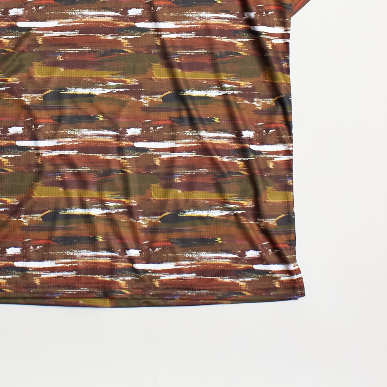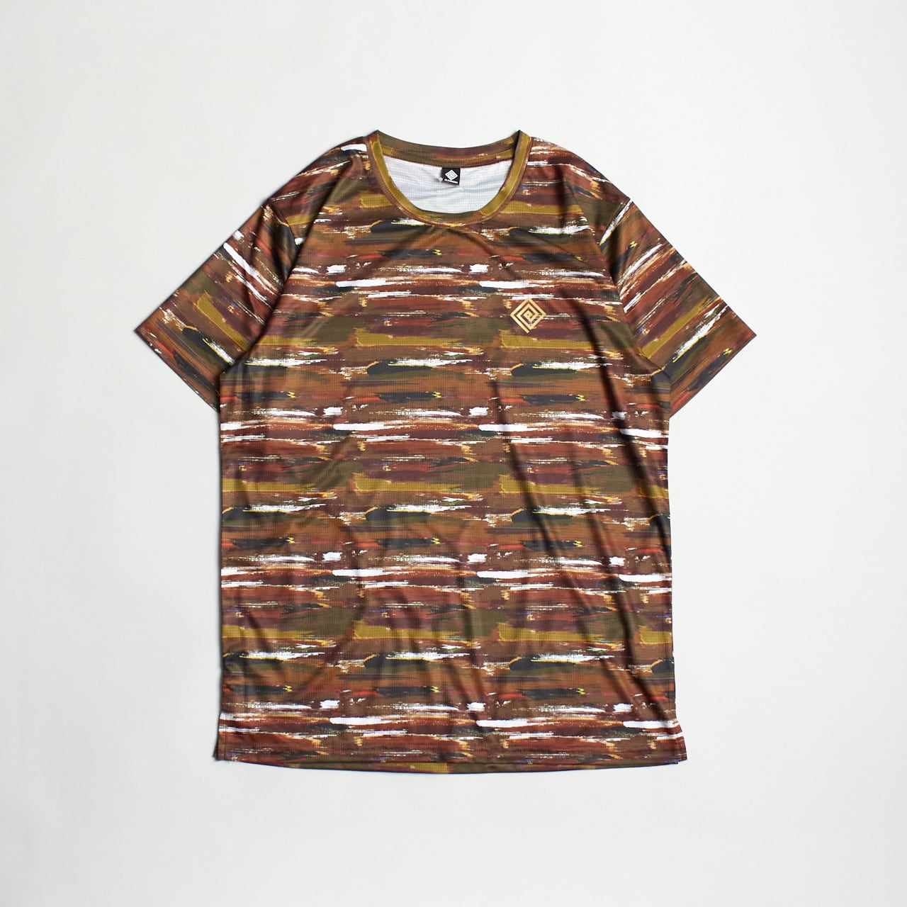 スポーツウェアで多用される昇華転写プリントによるデザインの可能性を最大限に活かすべく、緻密で色鮮やかなグラフィックを表現したオリジナルテキスタイルを使用したランニングシャツです。
