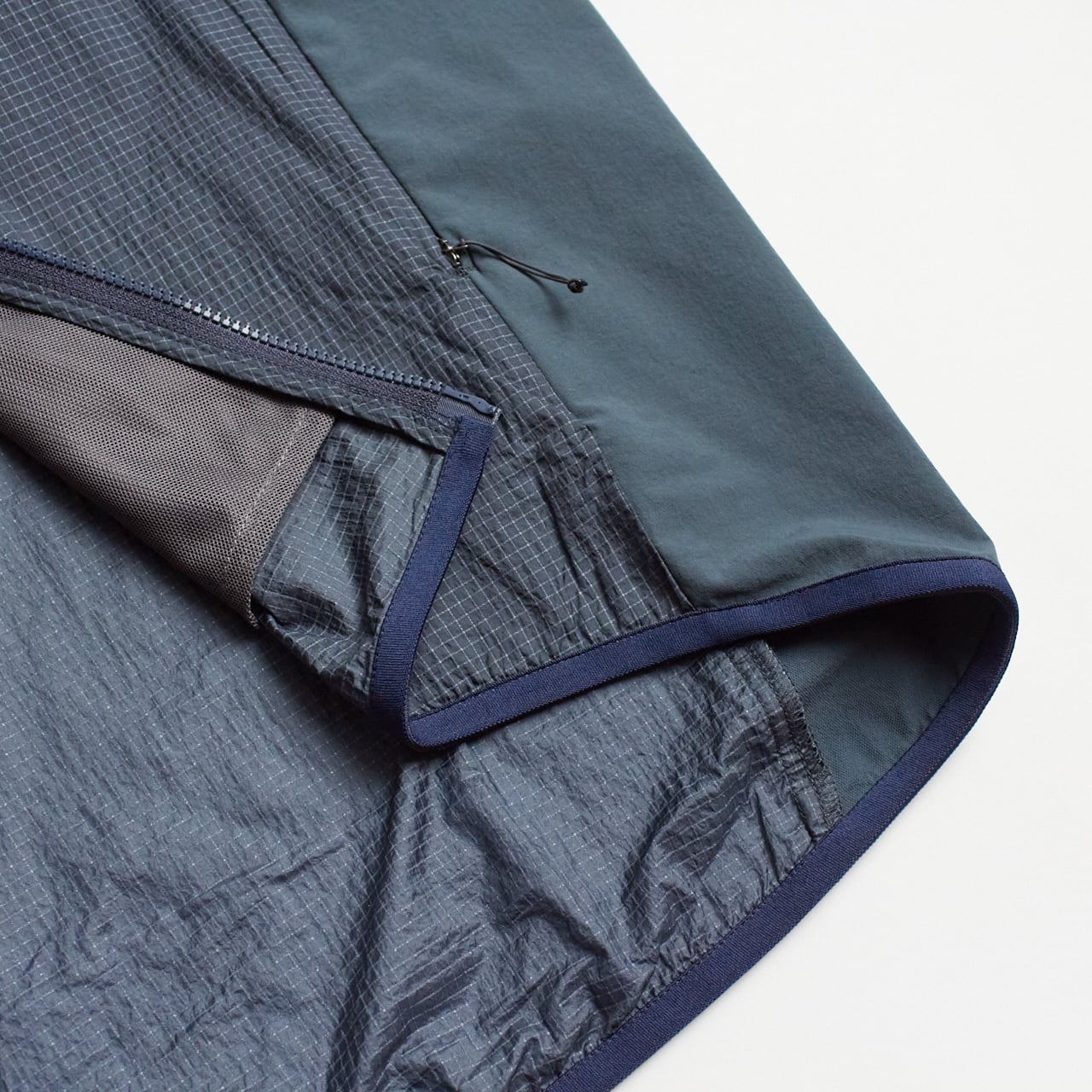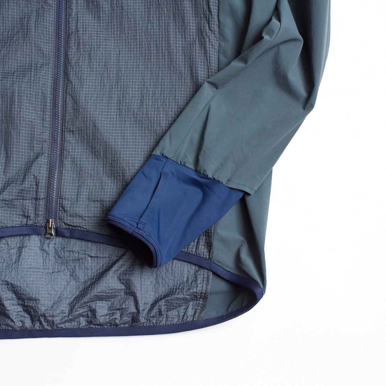 秋冬のマウンテンランニングを想定した新作のウィンドシェルです。メインの素材は、通気性とストレッチ性が高く、汗をかいたときも肌離れが良いソフトシェル。冷たい風を受けて生地が肌に触れたときも冷気が伝わりにくい一方で、通気性があるためオーバーヒートもしにくくなっています。肩から前身頃と背中のウェスト部分には、防風性と耐久性に優れるHPPE(ハイパフォーマンスポリエチレン)のリップストップ生地を使用。AERO JACKETと同様、両サイドにベンチレーション兼用の大型ポケット、右手首に小銭や鍵などを入れられるジッパー付きのポケット、左手首にはウォッチウィンドウを備えています。マウンテンランニングだけでなく秋冬の幅広いシチュエーションで重宝するウィンドシェルです。