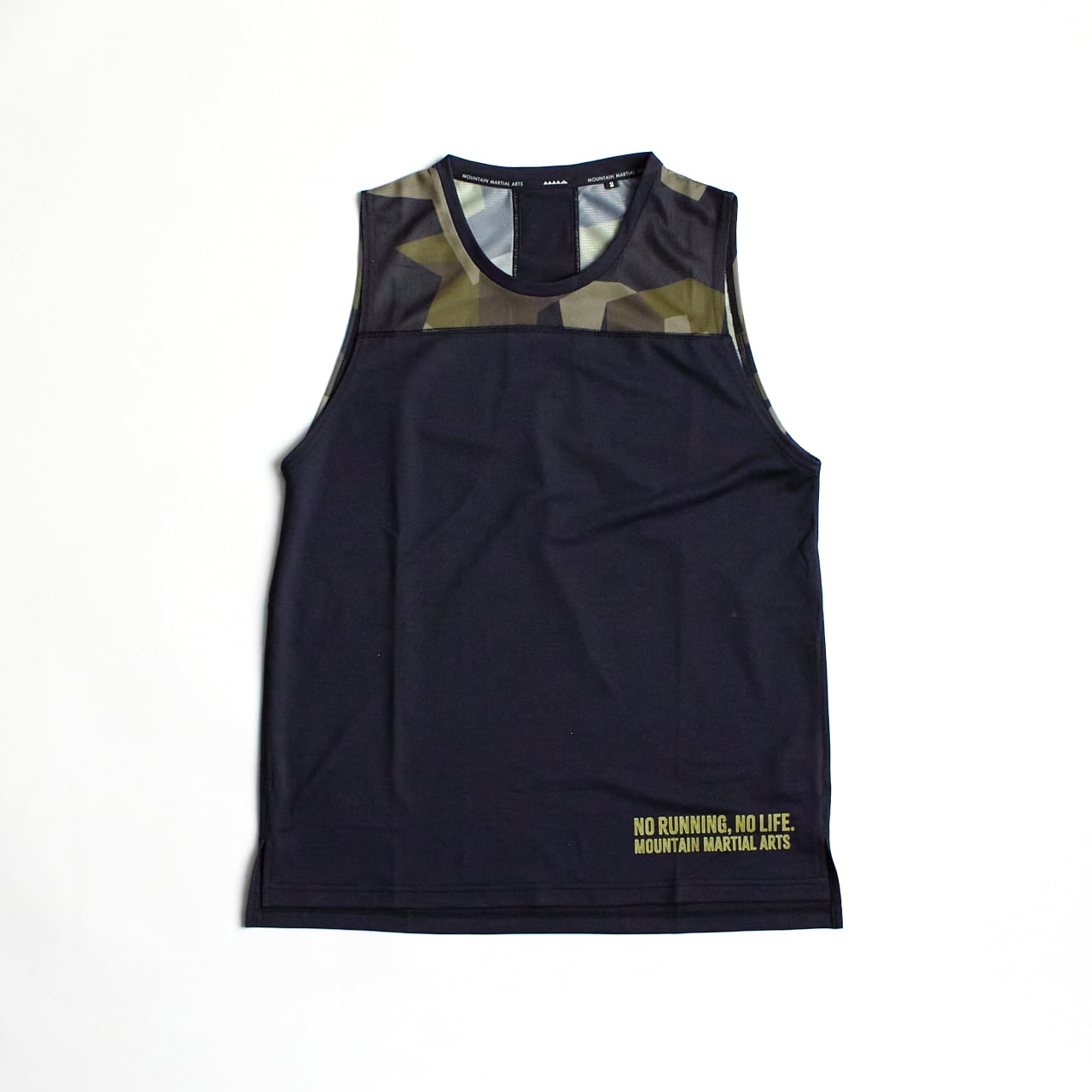日本製のオリジナルボディは、胸部と背面の肩甲骨部をCOOLMAX®の速乾メッシュで切り替え、通気性を向上。オリジナルカモフラージュを昇華転写プリントしている。肩甲骨に沿った切り替えは腕振りを遮ることなく、ランニング時の肩周りの動きをスムースに。