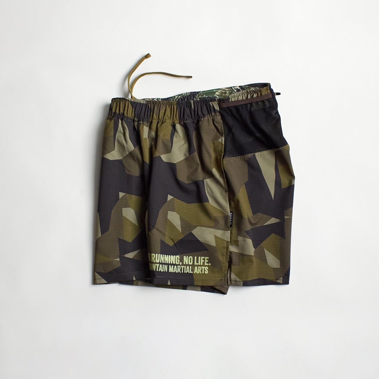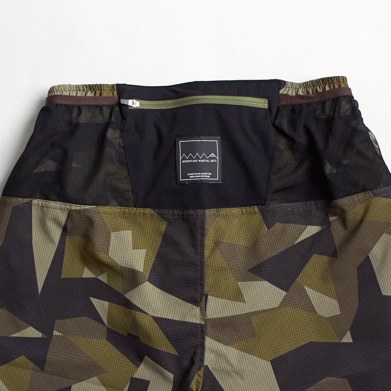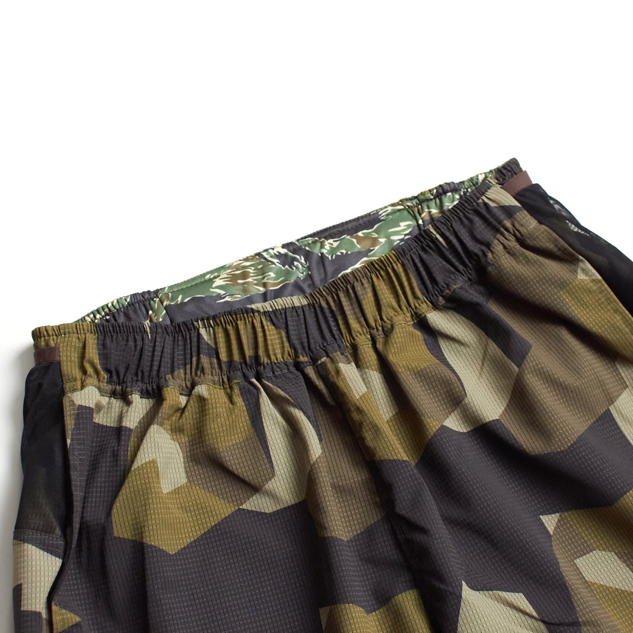 本体素材は、通風孔があり通気性の高い東レの機能素材Dot Air®︎を使用。吸水速乾と撥水加工に加えて薄く軽量で、長時間着用していてもストレスを感じにくい。足の稼働域を広げるガゼット部分はストレッチ性を持つDot Air®︎で切り返している。全面にオリジナルカモフラージュを昇華転写プリント。