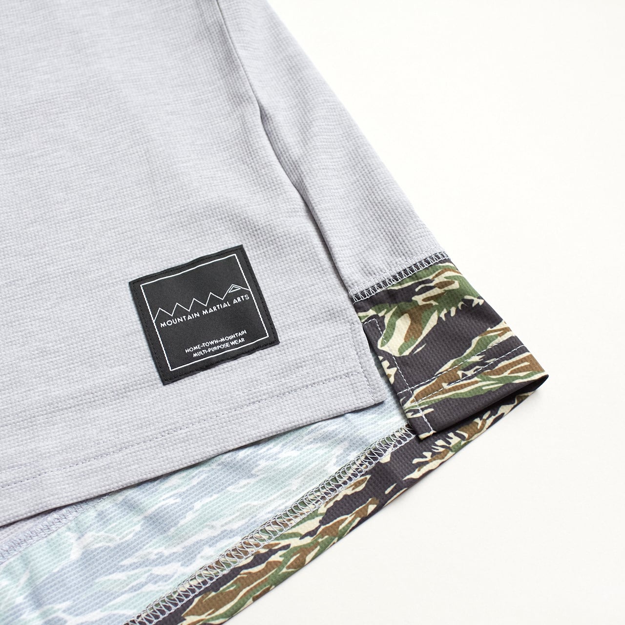 日本製のオリジナルボディは、アクティビティと日常使いの両方にほどよくフィットするレギュラーシルエット。胸元のポケットは落としにくいバインダーテープ式。裾のスリットと長い背面はクラシカルさを感じるディティール。下部をオリジナルタイガーカモに切り替えている。