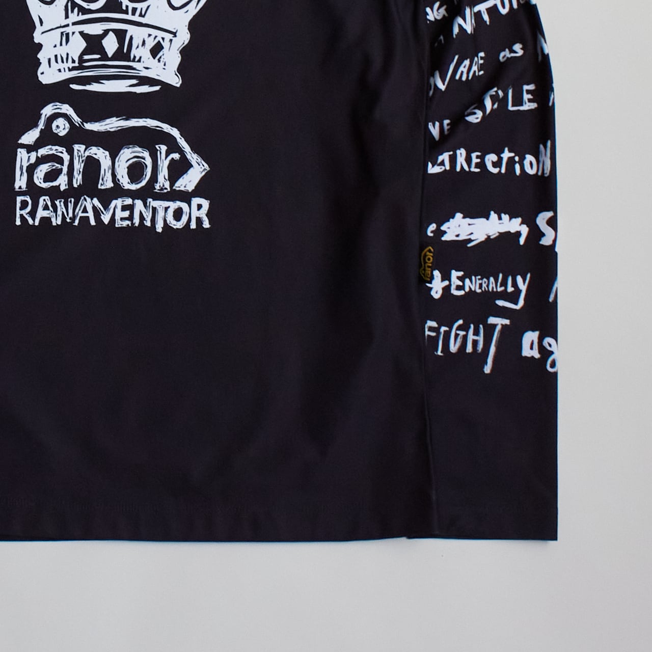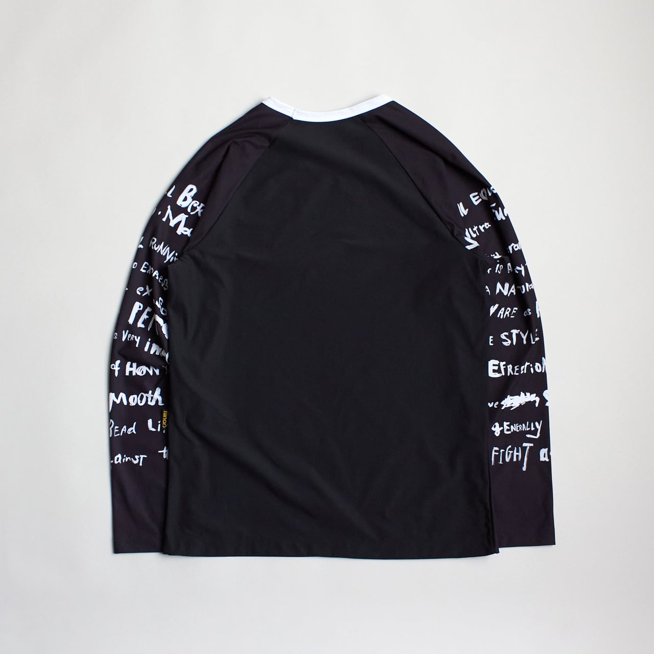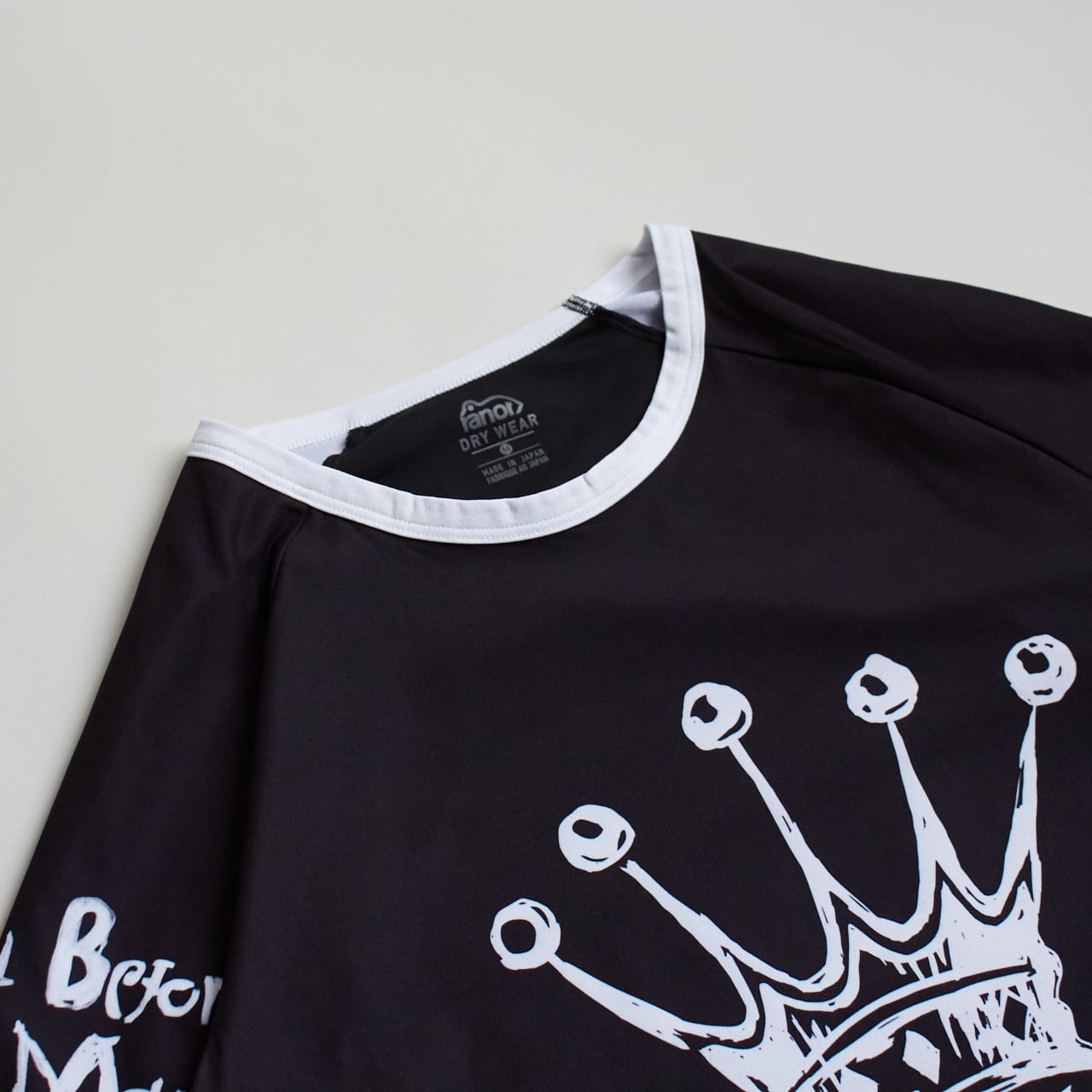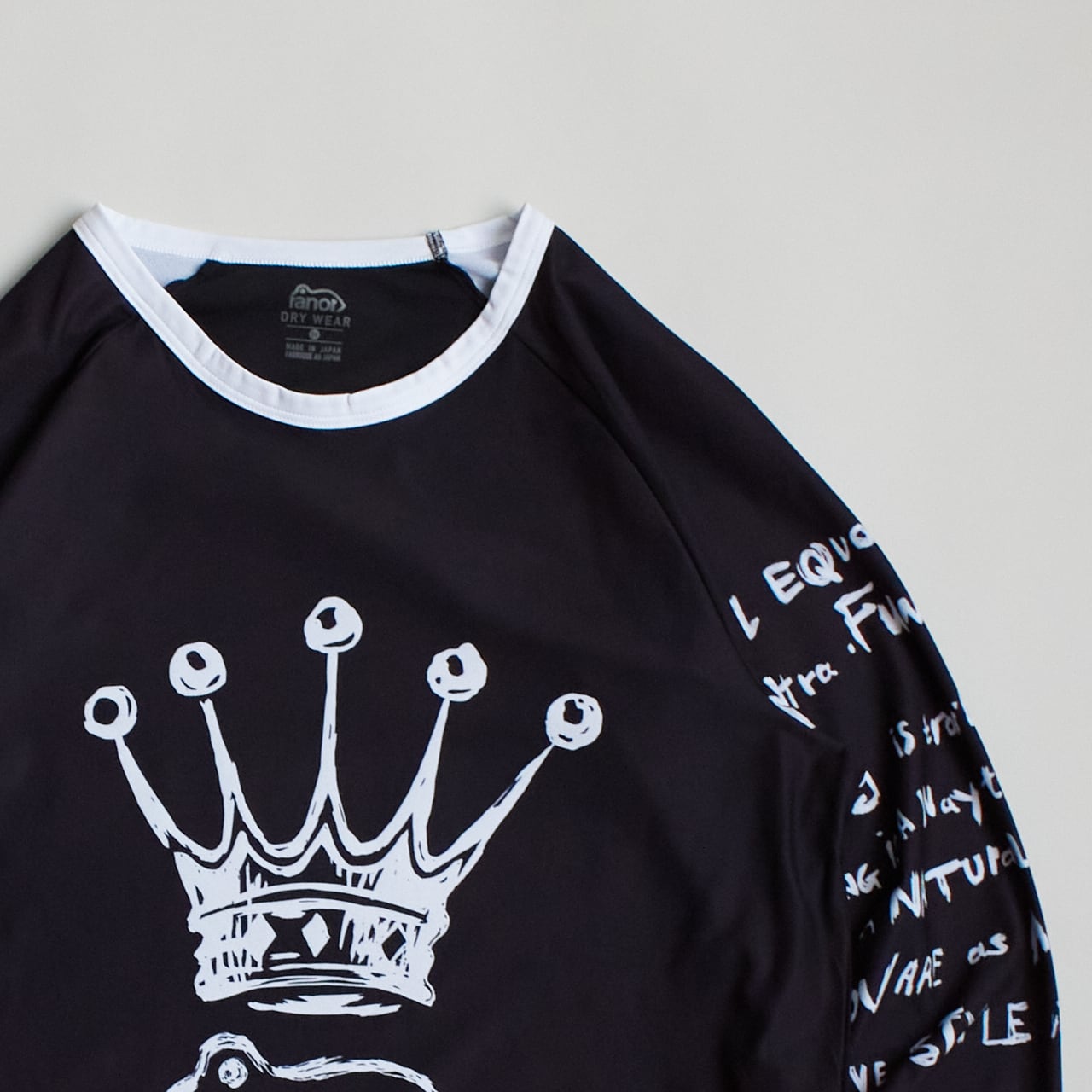 前身頃のクラウングラフィックと、両袖に配置されたMHLGプリントをすべてパネル裁断で仕上げたロングスリーブTシャツ。