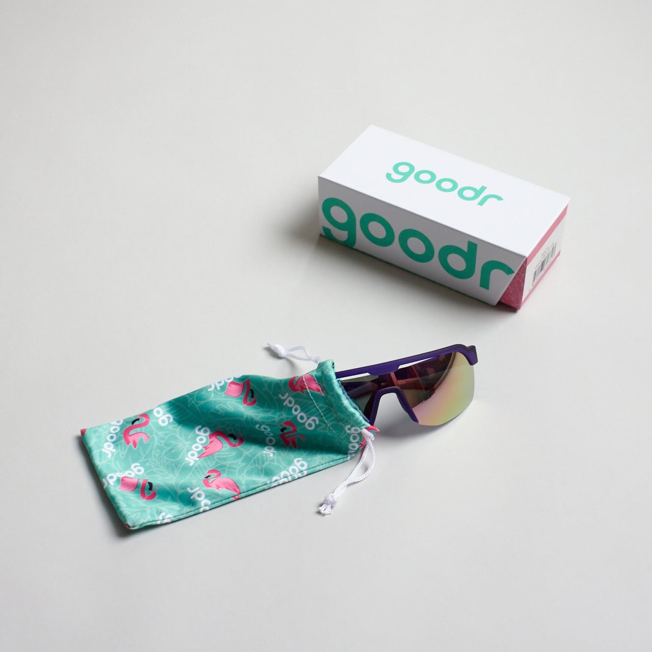 サングラスを入れているgoodr袋はマイクロファイバーのバックとなります。持ち運びはもちろん、お手入れにもぜひご利用ください。