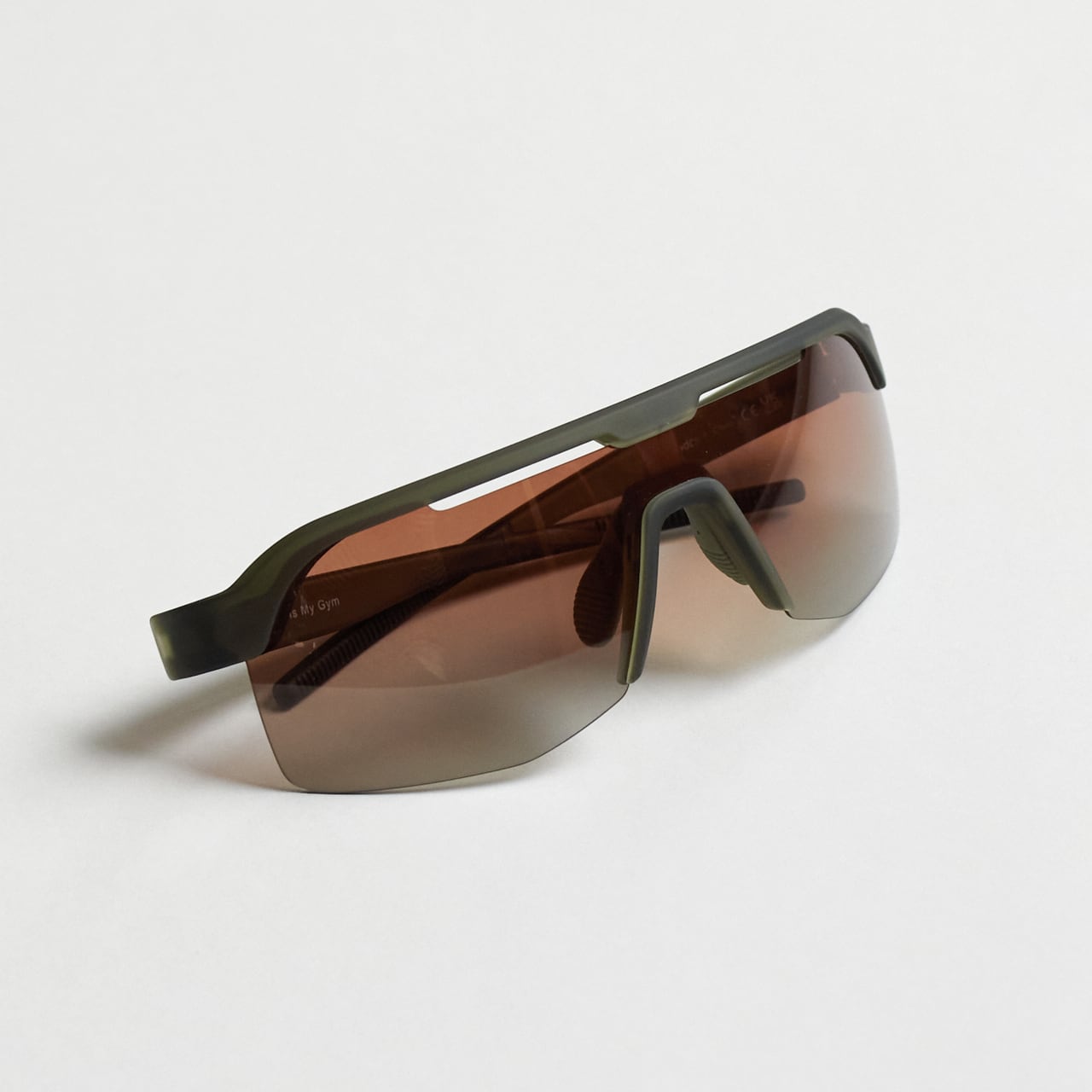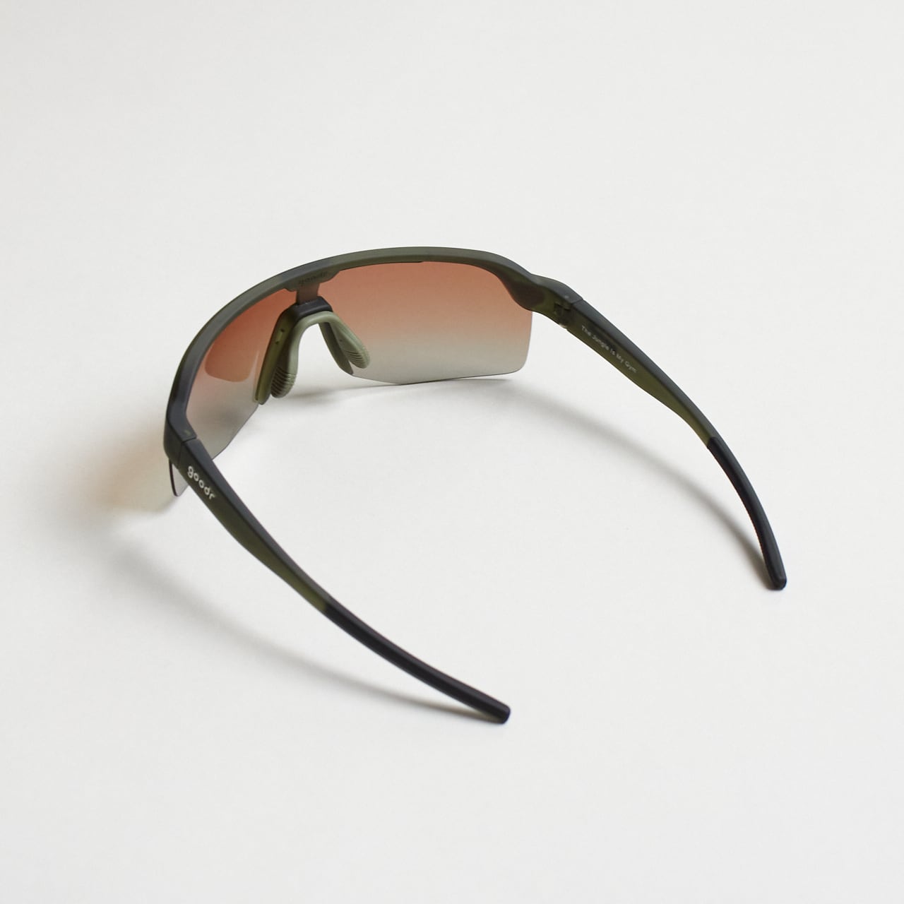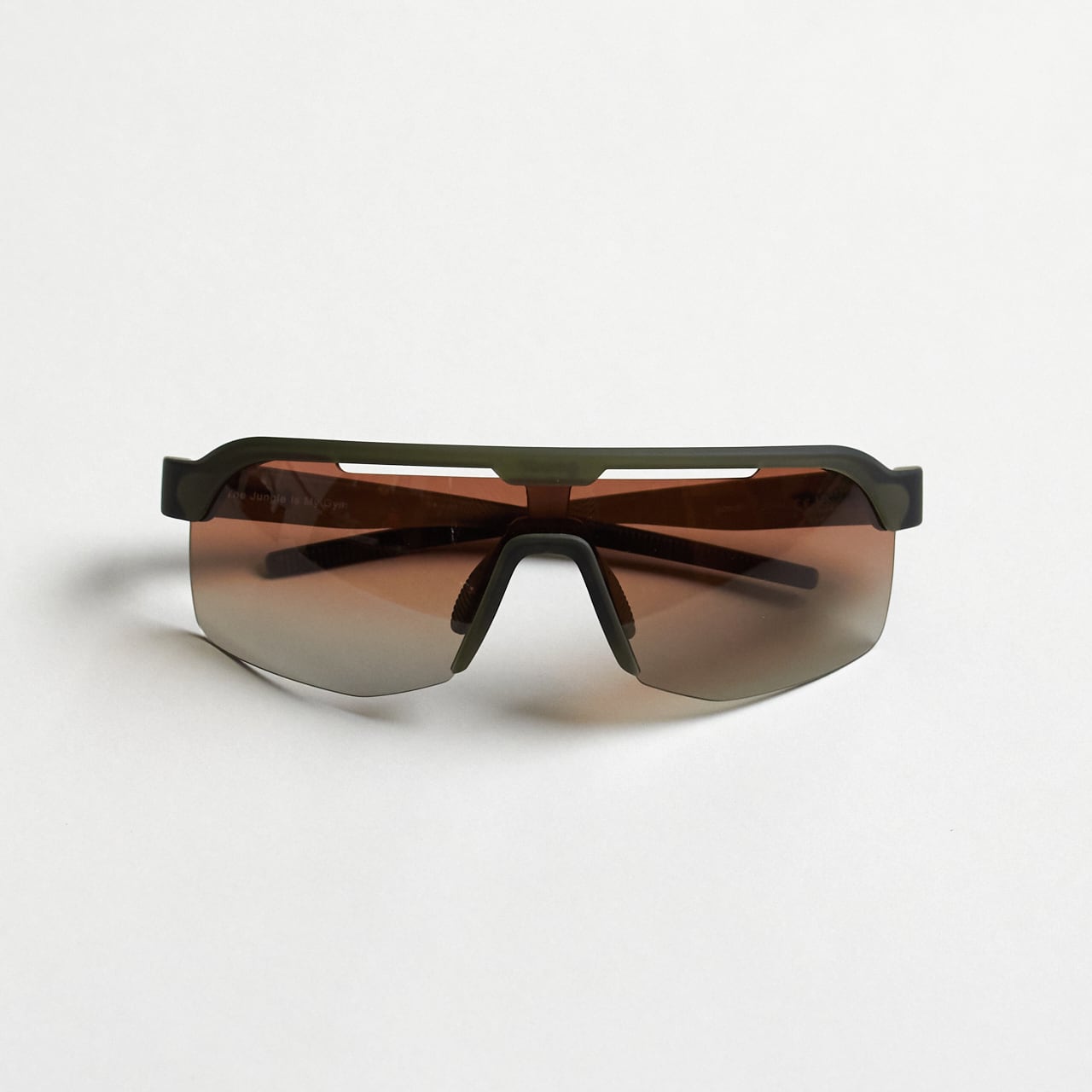 グリーンのシールドサングラス(ハーフリムフレーム+アンバーグラデーションレンズ)は、頭上からの光をガードしつつ、足元の視界をクリアにしてくれる。