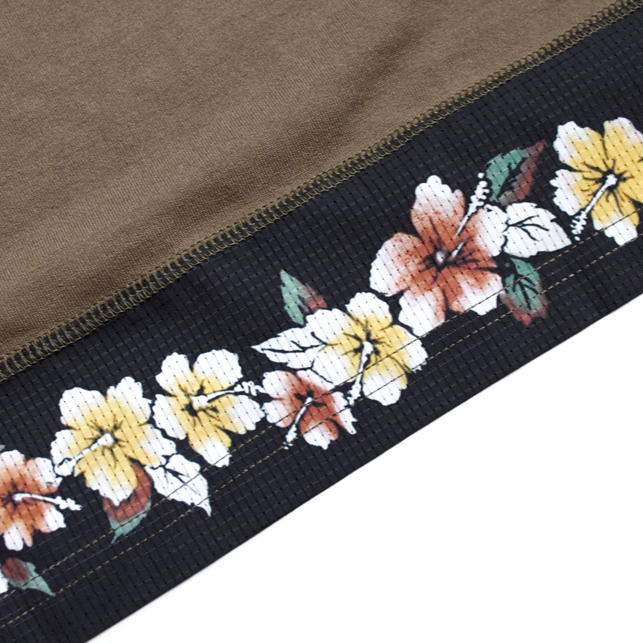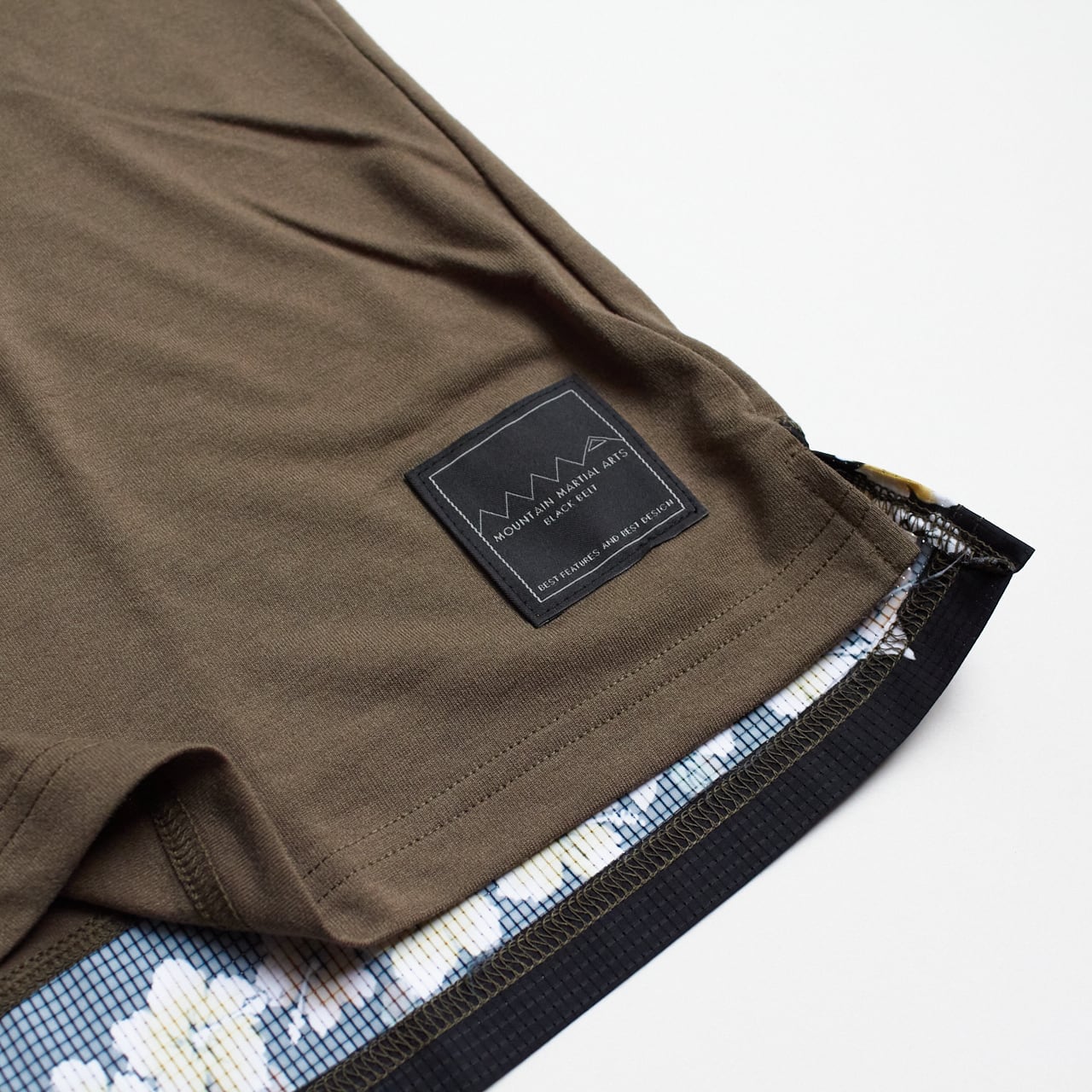 背面下部には MMAで使用されたプリント生地の端切れをランダムで切り替えており、