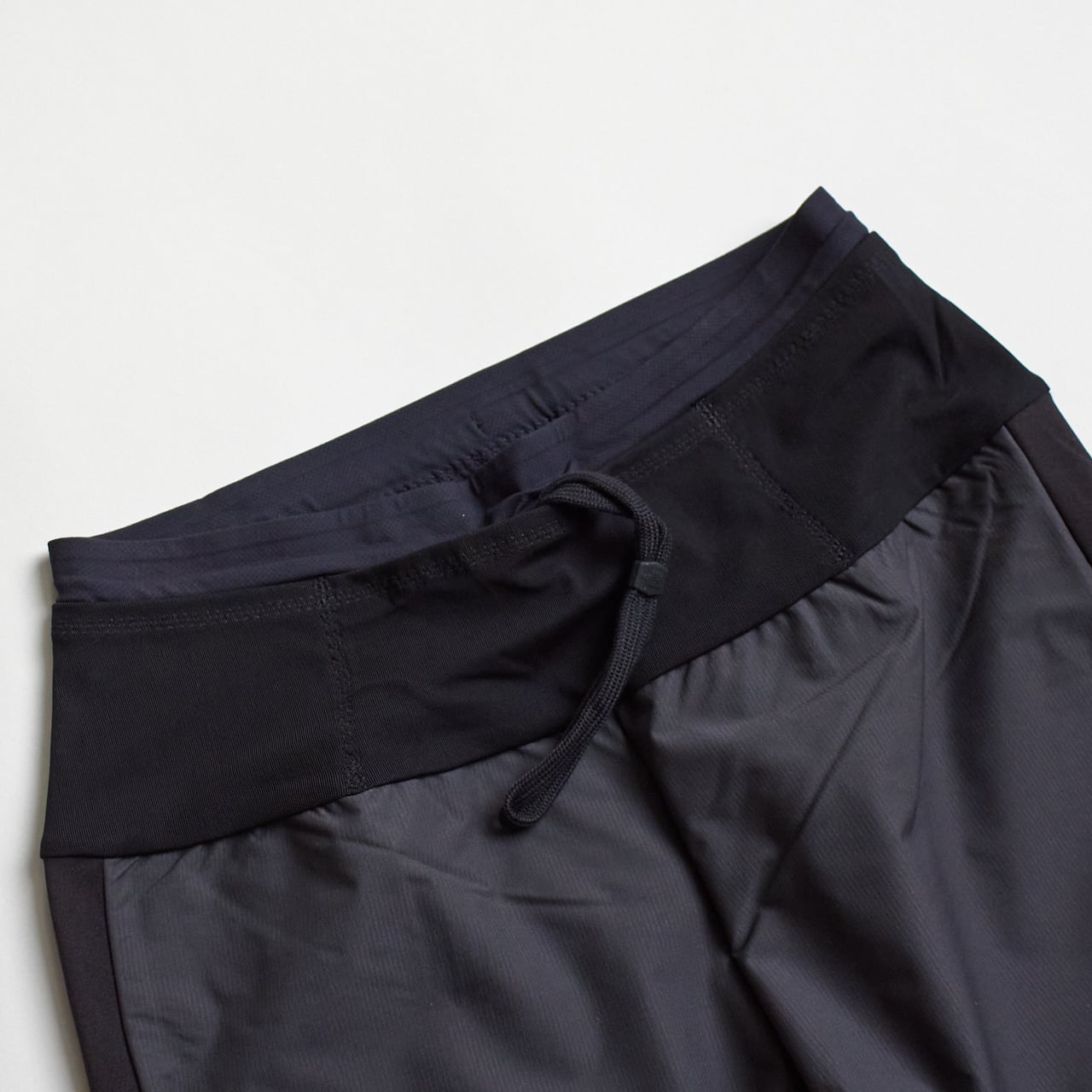 <前身頃・臀部当布>20D Recycled Nylon FUTURELIGHT(3層)(表側:ナイロン100%、中間層:ポリウレタンエレクトロスピニング膜、裏側:ナイロン100%)<前大腿部裏・後身頃>4Way Stretch Dry Tricot(ポリエステル75%、ポリプロピレン15%、ポリウレタン10%)<ウエスト>Nylon 2Way Tricot Dry Touch(ナイロン68%、ポリウレタン32%)