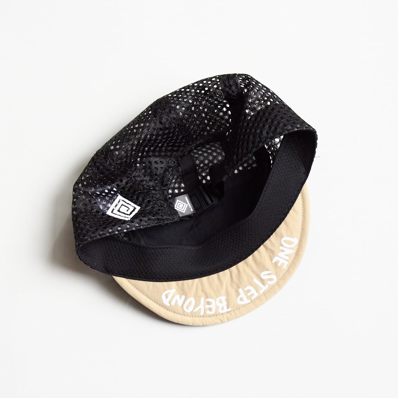 ブリム裏にも「One Step Beyond」のワードを手書き風のプリント配し、ツバを跳ね上げて被った際のアクセントになるように仕上げました。