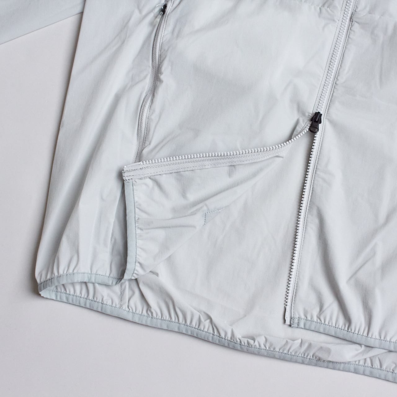 左右脇には小物の収納に便利なファスナーポケットを装備。フードには、着用時でも環境音を遮断しないためのレーザーホールを両耳部に加工しています。フードを装着しないときには首元と後頭部のマグネットで固定して、ランニング時や強風時のバタつきを抑えられます。夜間の視認性を高めるリフレクターロゴを採用。体に無駄なくフィットするややスリムなシルエットに仕上げた、ユニセックスモデルです。