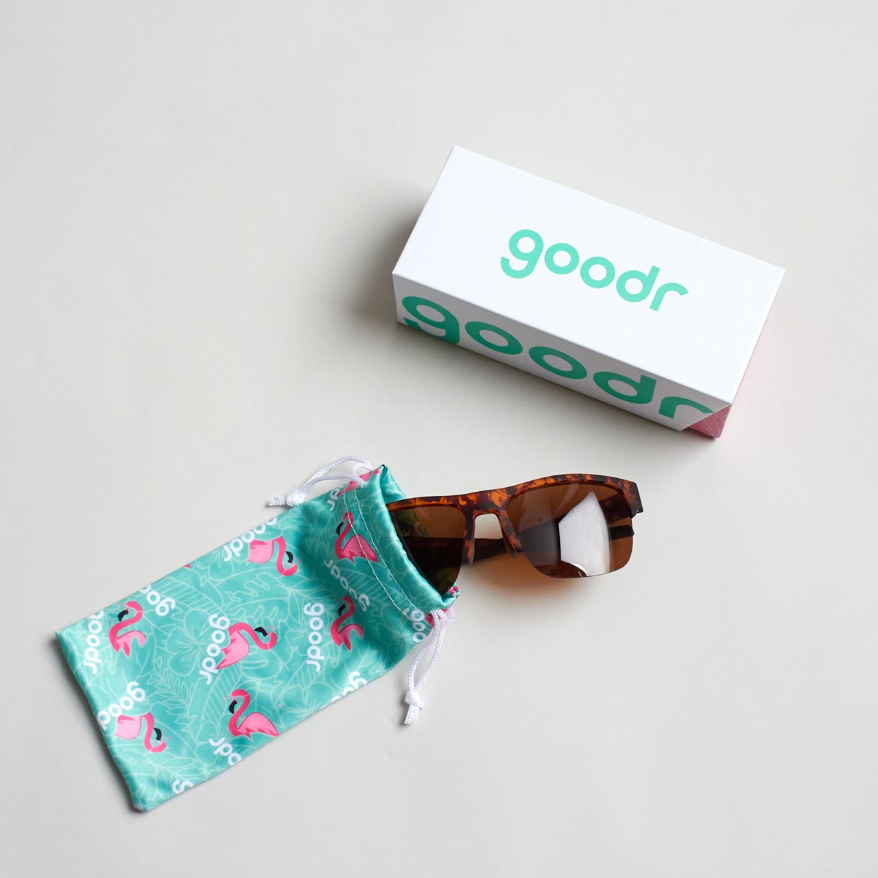 サングラスを入れているgoodr袋はマイクロファイバーのバックとなります。持ち運びはもちろん、お手入れにもぜひご利用ください。