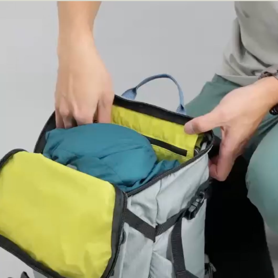 止水ジッパーを使用し、身体側に大きく開くクイックアクセス構造。電車での移動時や山での休憩時に使いやすいのが特徴です 。