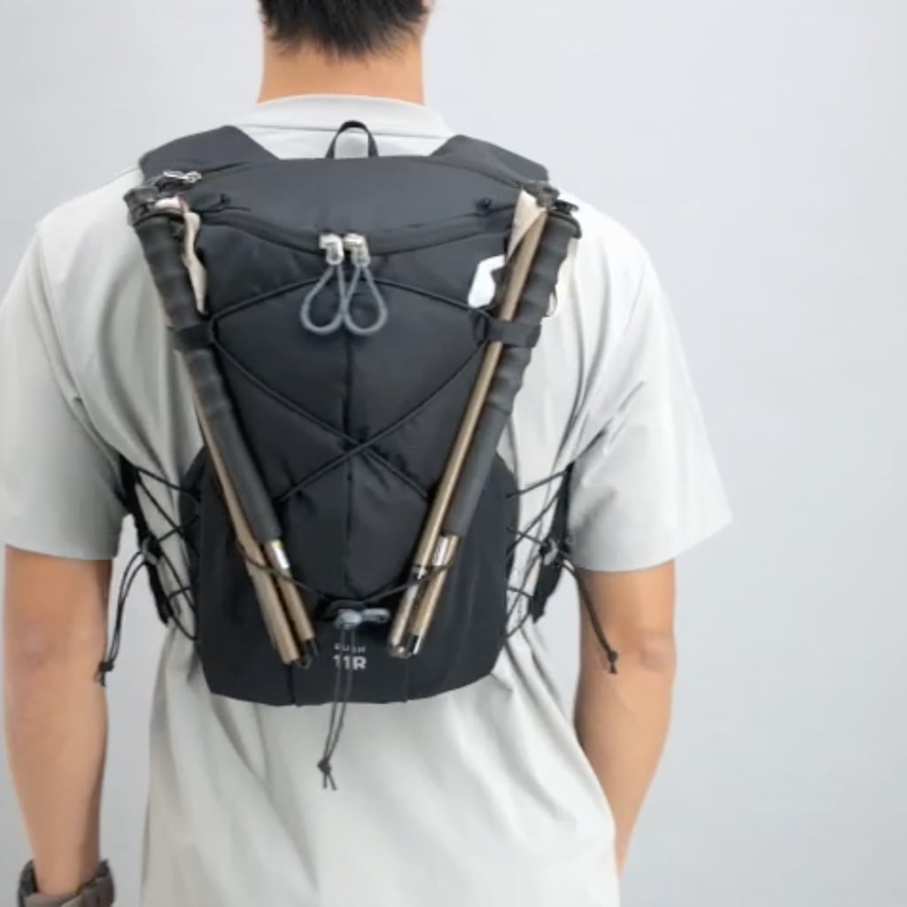 トレッキングポールは、ドローコードの両側に付いているホルダーに通して固定します。付属品のバンジーコードを利用して、好みの場所に取り付けることが可能。別売のRUSH ポールホルダーを付けることもできます。