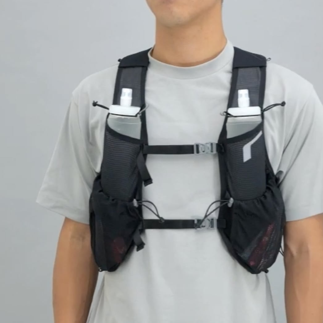 ボトルポケットは、600mlまでのソフトフラスクと500mlのペットボトルに最適化。ドローコードで脱落を防止します。右胸には緊急時用のホイッスル付きです。