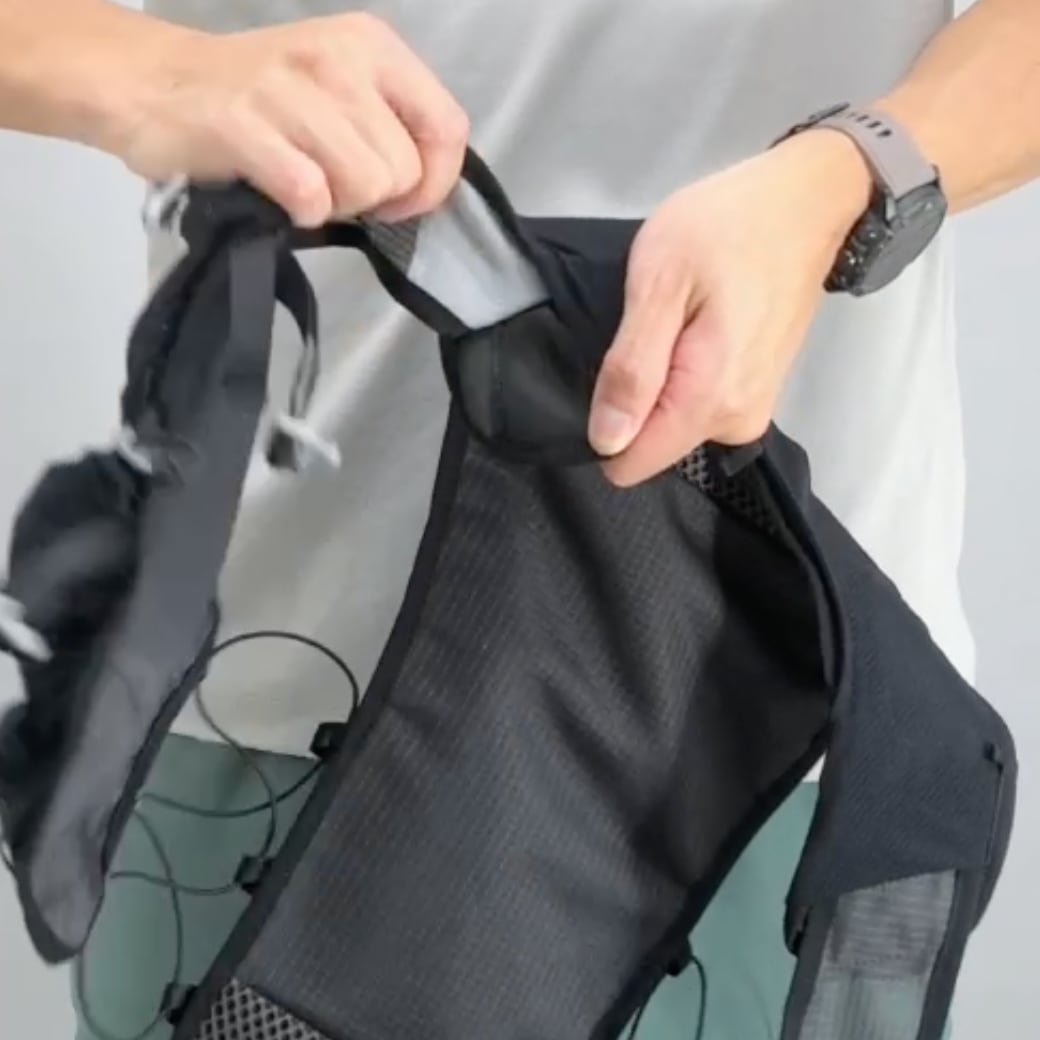 さまざまな体型のランナーにフィットするようにショルダーハーネスを設計。ベルクロで簡単に無段階調節ができます。調節はステッチを目安に行ってください。