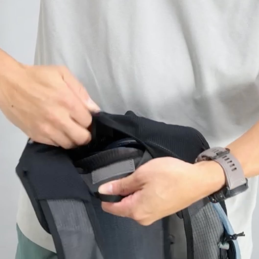 背中側にはハイドレーションパックが入るポケットがあり、ホースを肩から出せます。薄いシェルジャケットやレインパンツなどを入れると背中の荷物とのクッションになり快適に背負えます。
