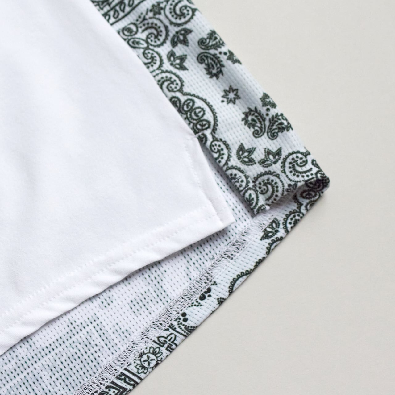 ヴィンテージバンダナプリントを施した布帛生地を組み合わせています。