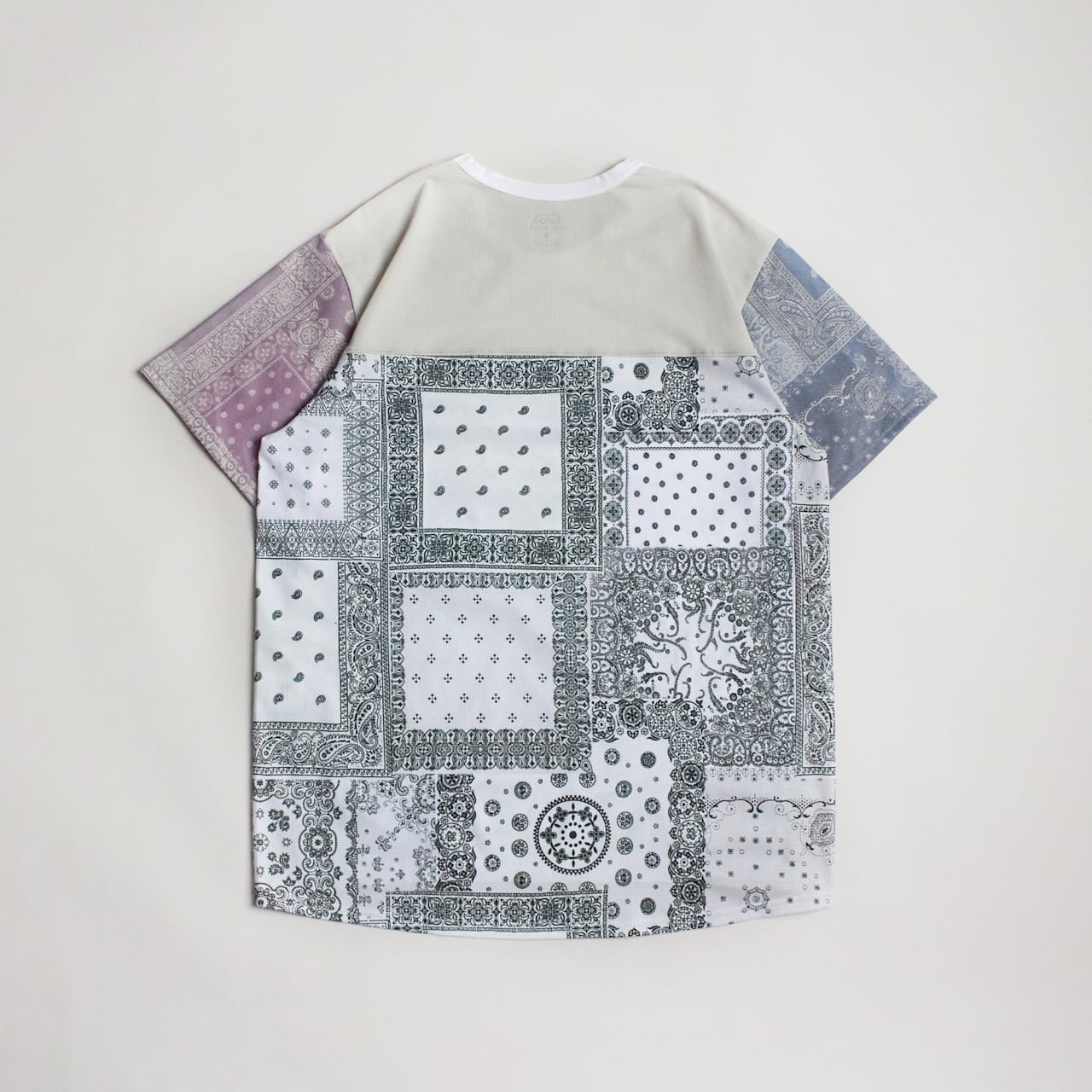 バンダナ柄の布帛をクレイジーパターンで組み合わせることで、