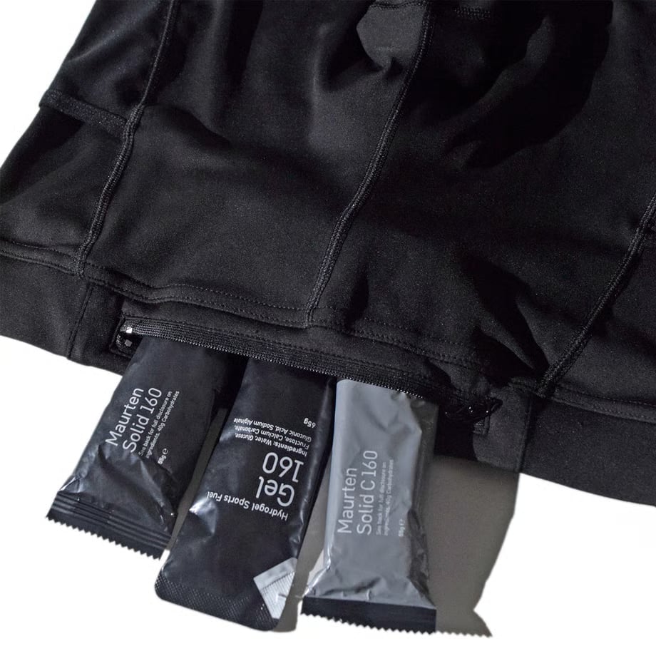 ジェルなどの小物の収納に便利なジップ付きの腰ポケットに加え、左右の腿にもメッシュポケットを搭載した機能的な仕様です。