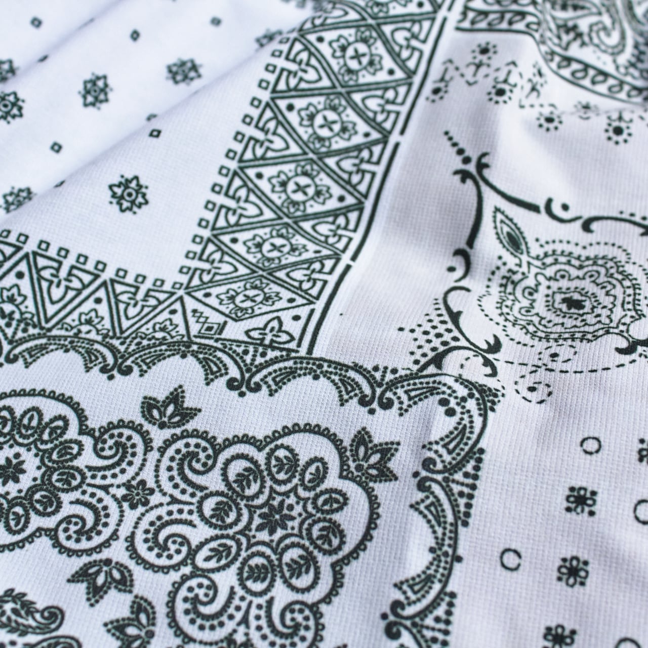 プリント部分に見られる擦れや色ムラは、ヴィンテージバンダナの風合いを再現したデザインです。