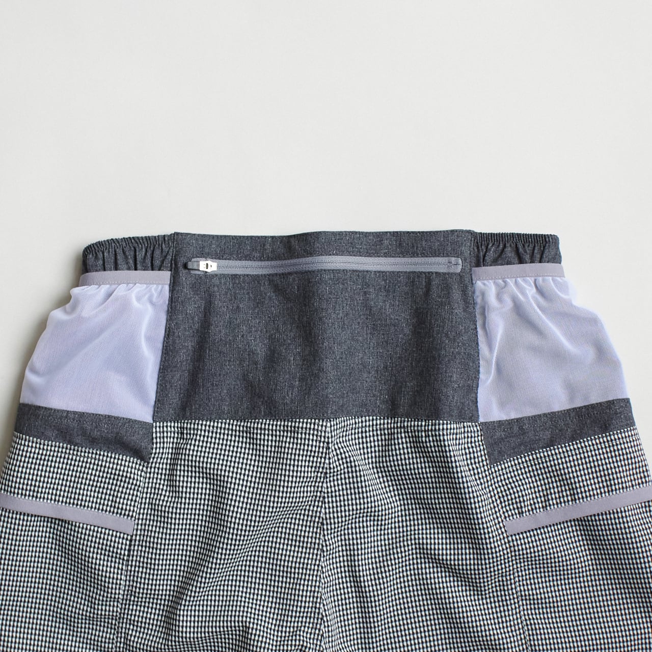 日本製のオリジナルボディは、スマートフォンや補給を収納できる 7 つポケットを装備。 背面腰部にはスマ ートフォンを収納できるセンターポケット。 身体の中心に重心があることで揺れを抑える。 腰回りはメッシュ ポケット。 脚部左右のカーゴポケットはマチをなくし、高い位置に配置することでランニング時の揺れを軽減。 ウエストはゴム+紐でフィット感を調整可能。