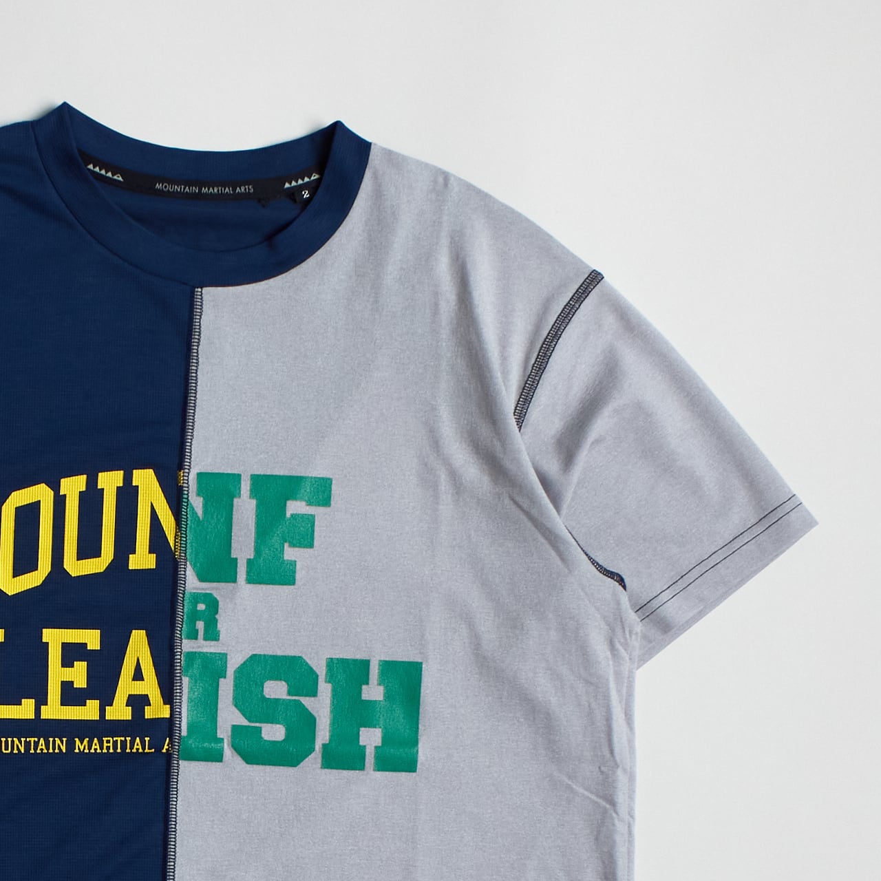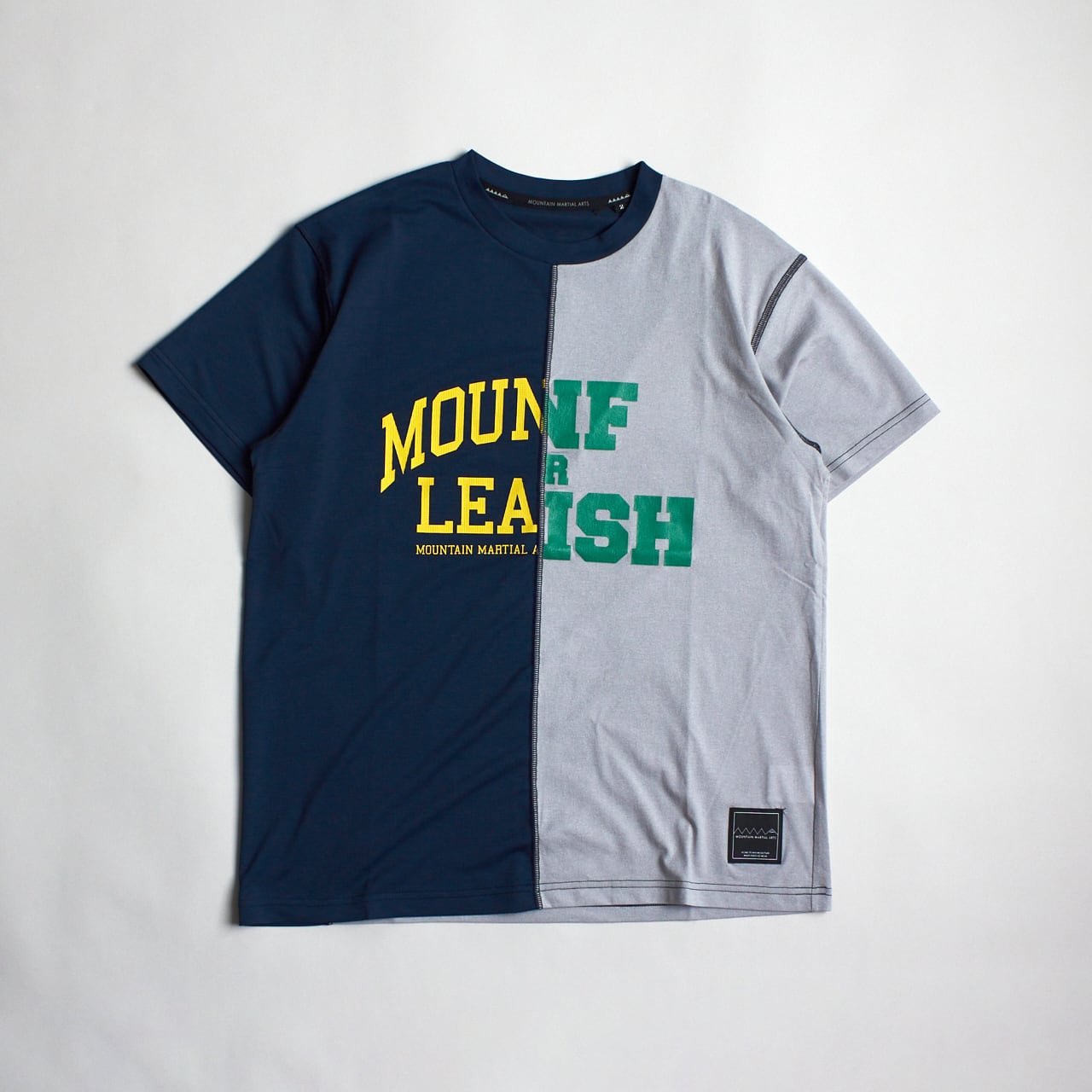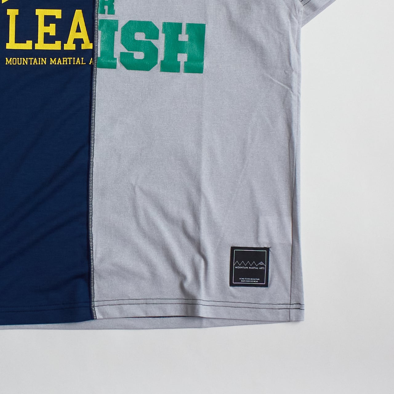 まるで別々のTシャツが合体したような、 右と左で素材とグラフィックが異なるランニングTシャツ。