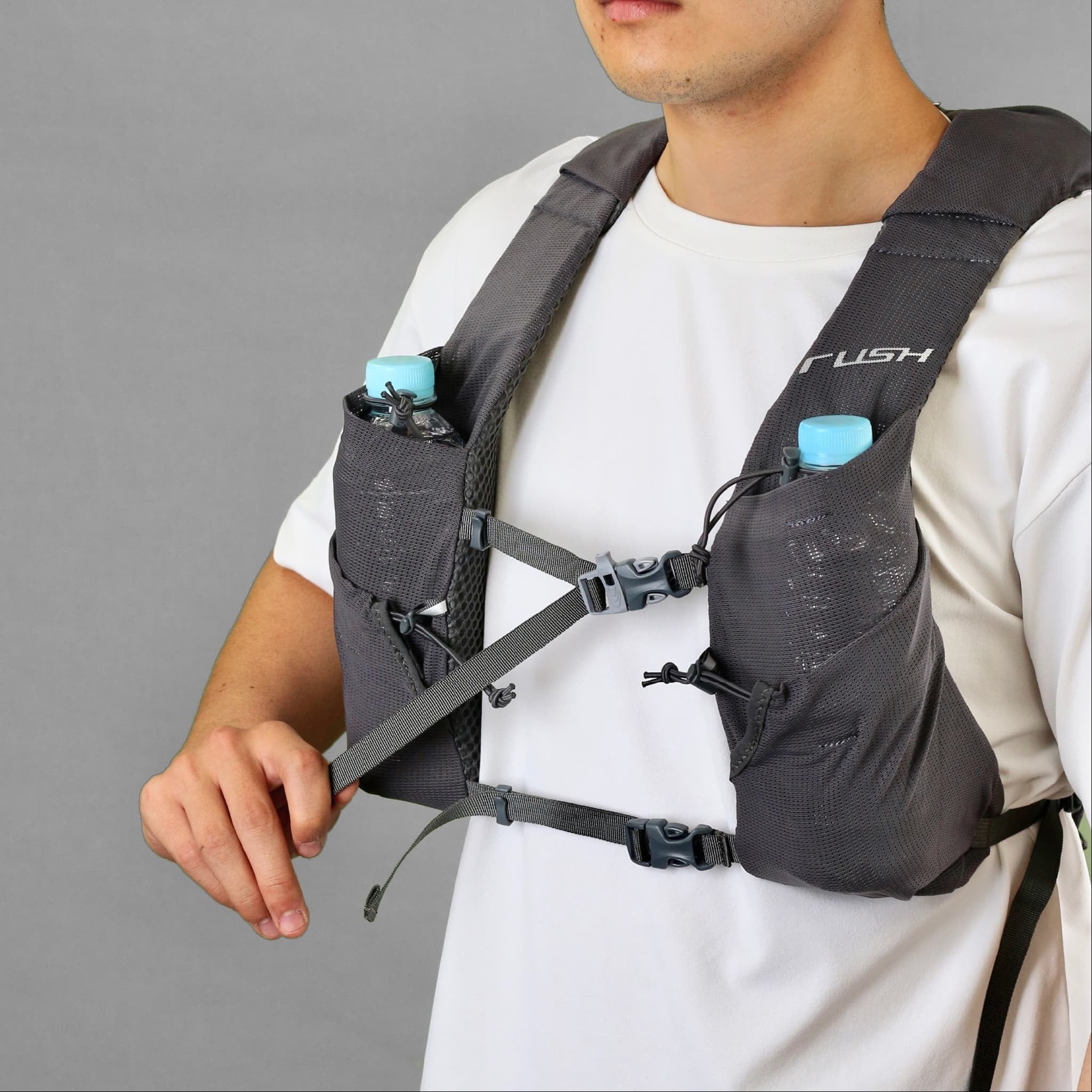 ハーネスの上段には500ccのペットボトルが収納できるポケットがあり、ドローコードによりボトルをホールドできます。