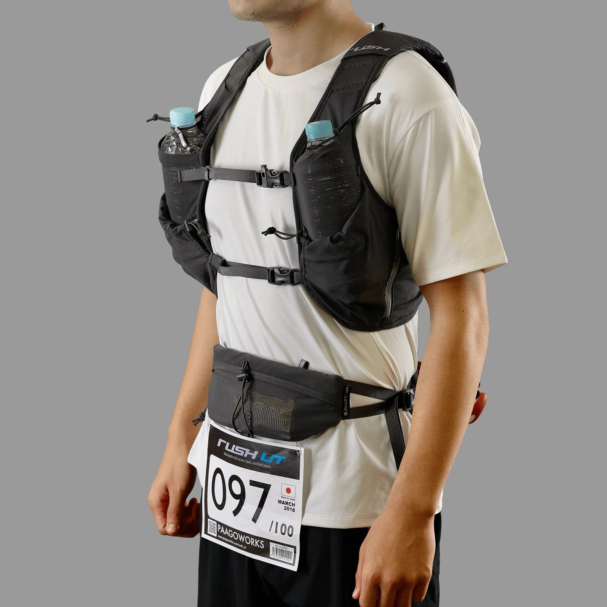 RUSHファミリーはもとより、さまざまなランニングパックと併用できるよう、上下の高さを抑えたデザインにしました。ランニングベルトにありがちな上下の揺れも少なく、ロングレースで活躍すること間違いありません。